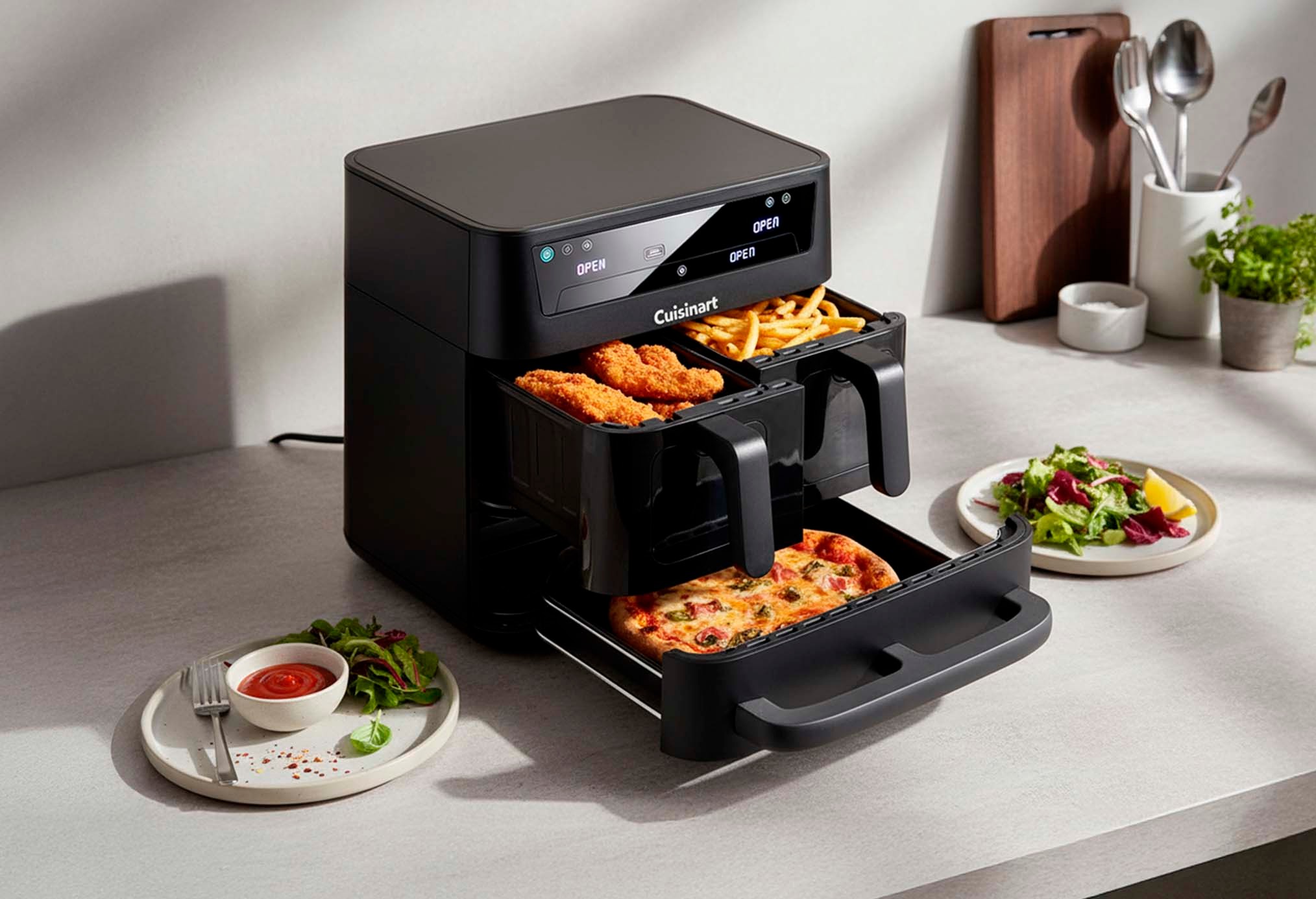 CUISINART TRI ZONE AIR FRYER FOUR L SANS PFAS ZONES PANIERS FONCTIONS AIRFRYER RôTIR GRILLER CUIRE RéCHAUFFER DéSHYDRATER PIZZA TOAST MANUEL ACIER INOXYDABLE