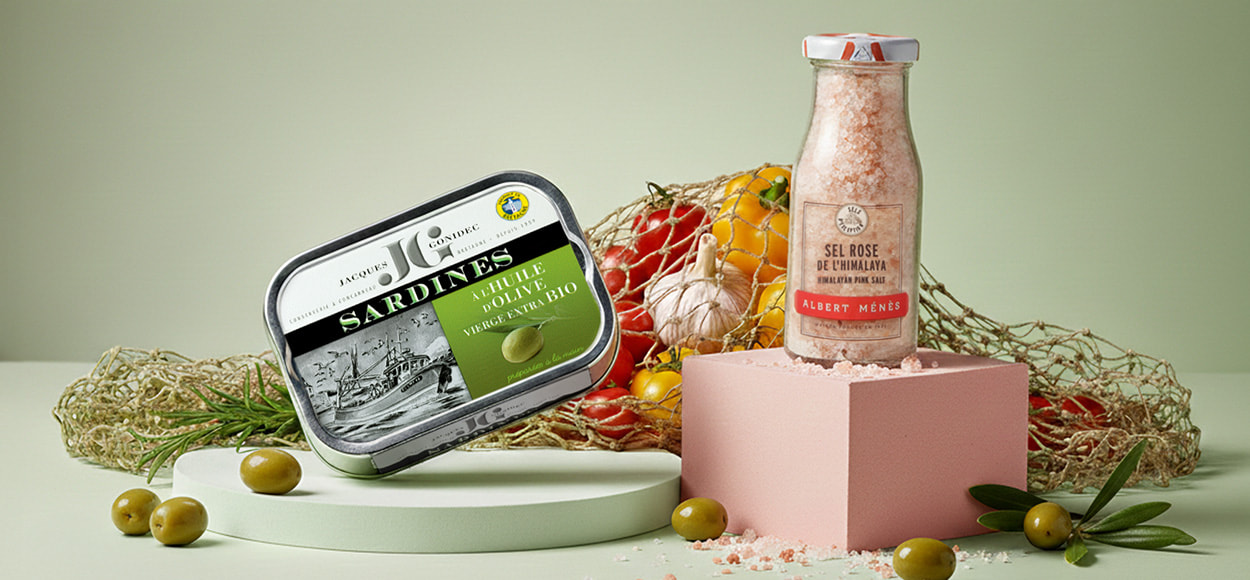 Un grand choix de produits pour vos repas en famille : épices sauces miels confitures Albert Ménès, conserves de poissons Jacques Gonidec, légumes secs Sabarot, plats cuisinés terrines Paul Larédy, pâté, jambon et saucisson Charcuterie Ader.